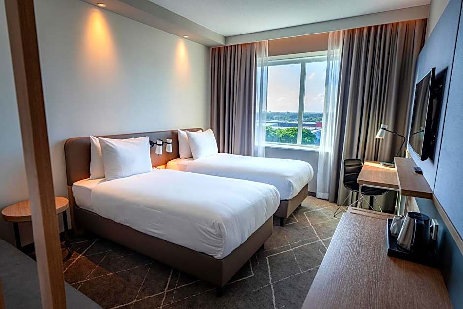 A diverse range of room types is available, including Standard, Queen, King, Twin, and Apartment Standard options. The property has 3,341 reviews, reflecting widespread guest feedback and the four-star status. Prices start from per night, presenting solid value for travelers seeking a well-equipped stay near Eindhoven’s Flight Forum area.